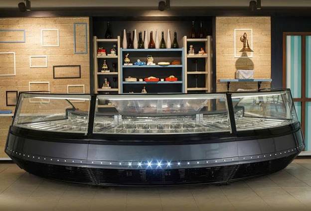 Sự kết hợp của hai tủ Prisma S45 theo góc 45° còn tạo ra một góc cong 90° hoàn hảo – lý tưởng cho những quầy gelato muốn tạo điểm nhấn về mặt bố cục, mang lại hiệu ứng trưng bày liền mạch, mềm mại và cực kỳ chuyên nghiệp.